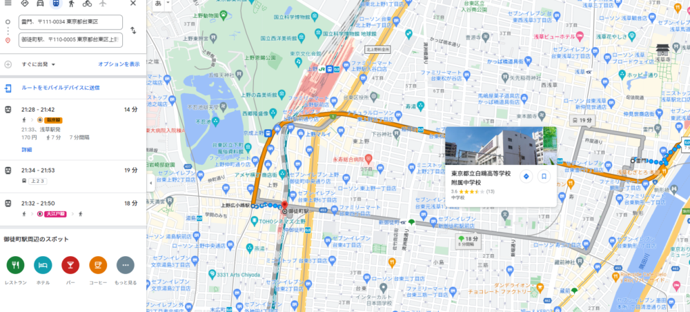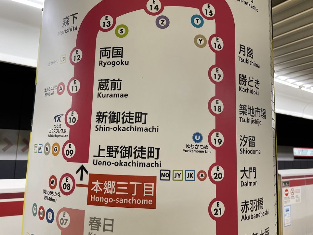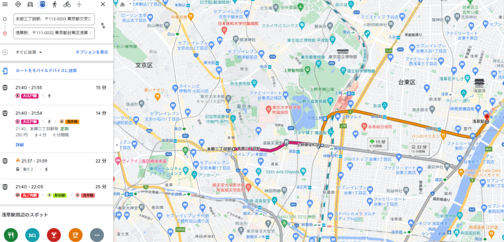 大江戸線 本郷三丁目駅 → 上野御徒町駅、銀座線 上野広小路駅 → 浅草駅