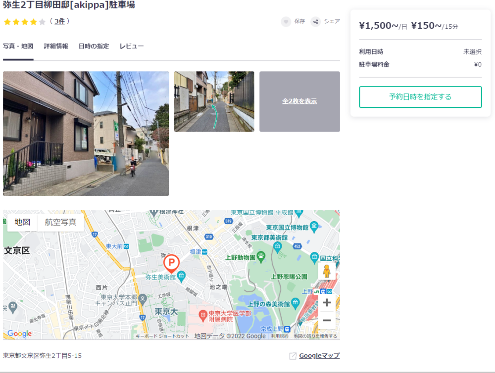 私は、akippaを利用して弥生門の近くの駐車場を予約しました。1時間150円~、1日最大1,500円で、とてもリーズナブルに駐車できました。